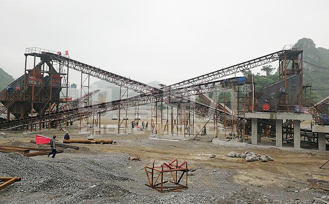 廣西來賓的這個砂石骨料生產線由中譽鼎力建設,每小時的產量可達800噸,于2018年4月建成并投產。在生產線的設備選擇上,使用了錘破加整形破的搭配組合,能夠很好對原料進行破碎處理。整個生產線的工藝流程大致為物料由給料機輸送至頭破錘破中,在經過粗碎后由皮帶機運輸到二級整形破進行細碎處理,之后振動篩將不同粒度的成品物料篩分開來。生產線自建成后運行至今,沒有出現過大的故障,運行穩定。