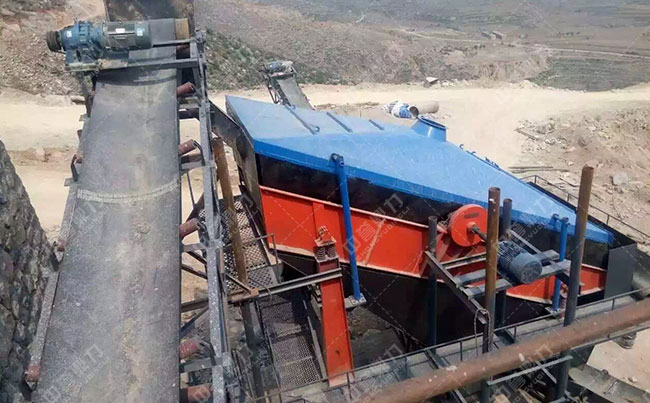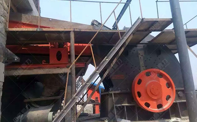在骨料生產(chǎn)線生產(chǎn)現(xiàn)場,我們可以看到錘式破碎機(jī)承擔(dān)了頭破的作用,將大塊的石灰石進(jìn)行破碎,生產(chǎn)線建設(shè)依托的地勢,輸送過程方便快捷,無需使用過長的輸送帶。