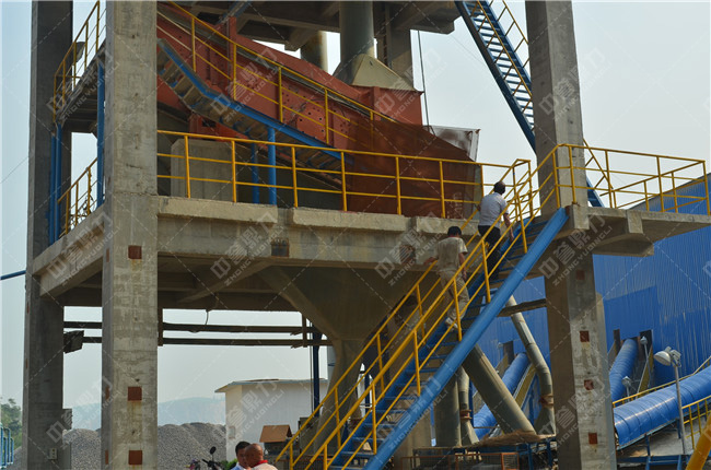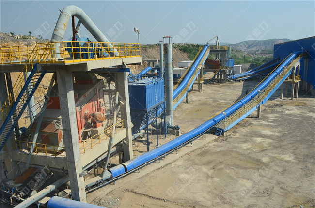 石料從山上爆破下來,通過自卸車將小于400mm的石料送入振動給料機,振動給料機把石料均勻的送入錘式破碎機,錘式破碎機對石料進行段破碎,從錘破出來的石料在70mm以下,再通過皮帶機輸送至反擊破進行二級破碎,破碎后的物料由皮帶機輸送至制砂機進行細碎,細碎后的物料再通過圓振篩進行粗砂、中砂、細砂等規格的篩分。對于砂子含粉量要求嚴格的可在細砂后面加配洗砂機,洗砂機排放的污水可再經細砂回收機進行回收,一方面減少環境污染,另一方面可提高制砂產量。