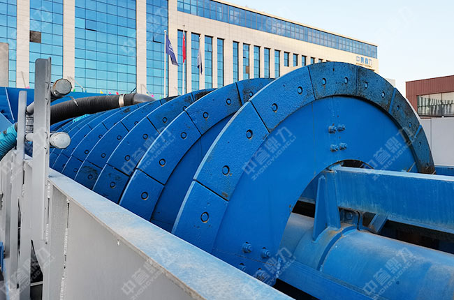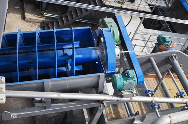 砂子經過傳送帶送至螺旋洗砂機的清洗箱內,隨著螺旋葉片的轉動和摩擦,比重低的雜質和異物會留到水中,比重大的砂子則會隨著螺旋葉片的推力繼續向上運動。這其中隨著接連不斷的摩擦和螺旋葉片的推動,到尾端會僅剩干凈顆粒均勻的砂子被送到脫水篩上。