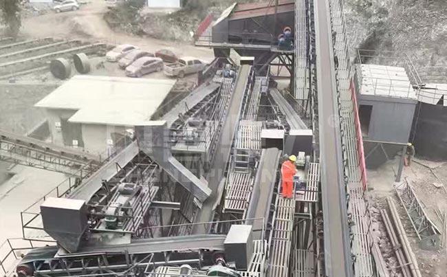 進(jìn)入半成品料倉(cāng)后被輸送至中碎車間篩選進(jìn)行分級(jí)處理,粒徑大于80mm的特大石重新進(jìn)入破碎機(jī)加工,粒徑在40-80mm之間的大石經(jīng)過(guò)高壓水沖洗后進(jìn)入成品料倉(cāng),粒徑小于40mm的骨料進(jìn)入圓筒洗石機(jī)洗泥,粒徑為2.5-40mm的骨料重新分級(jí)處理,中、小石在分級(jí)的同時(shí)經(jīng)高壓水洗凈、脫水后進(jìn)入成品料倉(cāng);粒徑在2.5-5mm的骨料直接進(jìn)轉(zhuǎn)料倉(cāng)與洗凈后破碎的干料混合形成制砂料源,小于2.5mm的細(xì)砂及泥粉進(jìn)入粉泥分級(jí)處理系統(tǒng)。